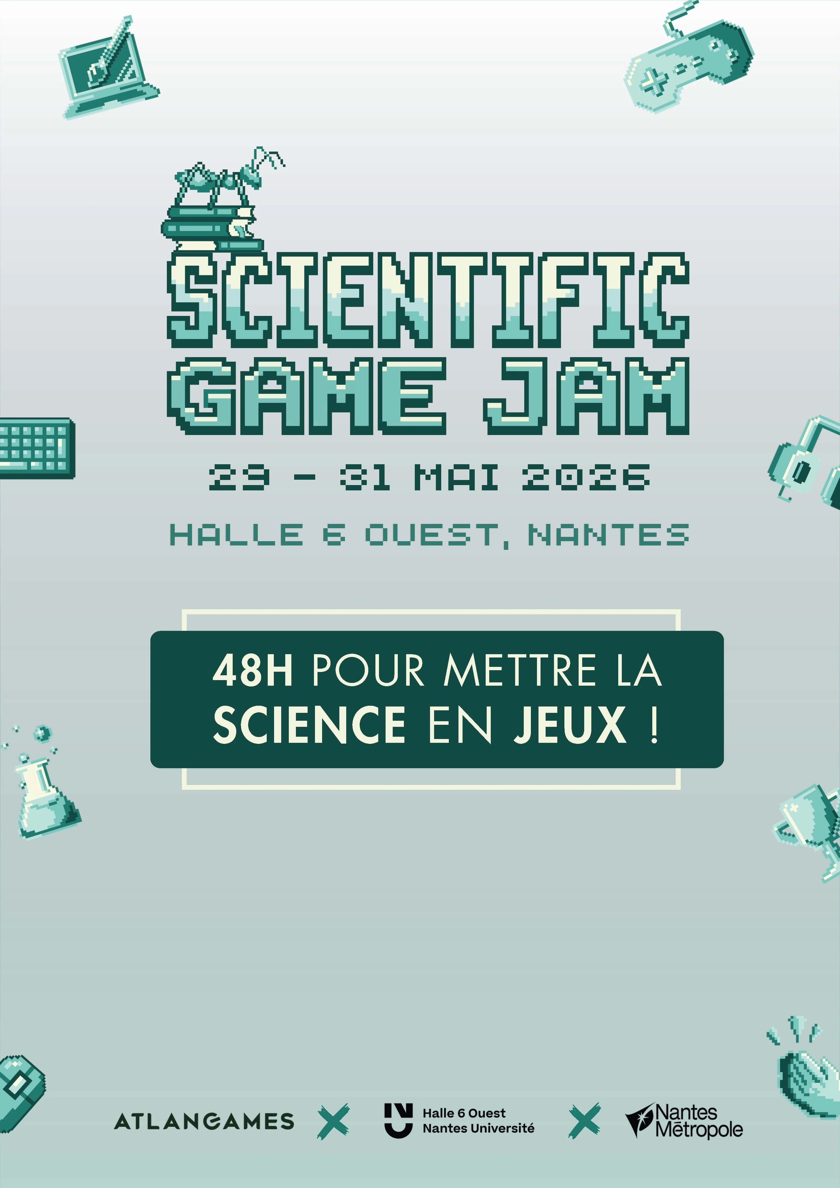 Du 29 au 31 mai 2026, la Scientific Game Jam, organisée par Atlangames et la Halle 6 Ouest - Nantes Université, avec le soutien de la Mission CST - Nantes Université, fait son retour à Nantes et s’intègre à l'événement Chtiiing, les journées nantaises de la créativité !